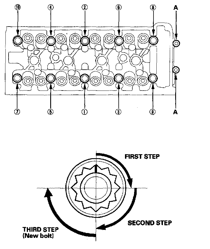 Cylinder headTighten the cylinder head bolts in sequence to 29 Nm (3.0 kgf-m, 22 ft. lbs.) Use a beam-type torque wrench. When using a preset-type torque wrench, be sure to tighten slowly and do not overtighten. If a bolt makes any noise while you are torquing it, loosen the bolt and retighten it.