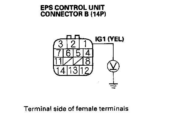 12. Measure the voltage between EPS control unit connector B (14P) terminal No. 1 and body ground.
