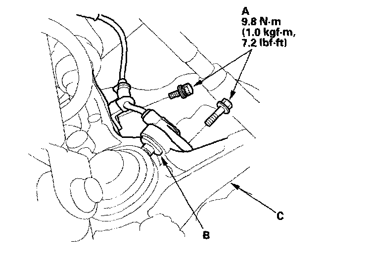 5. Remove the flange bolts (A) and wheel sensor (B) from the knuckle (C). Do not disconnect the wheel sensor connector.