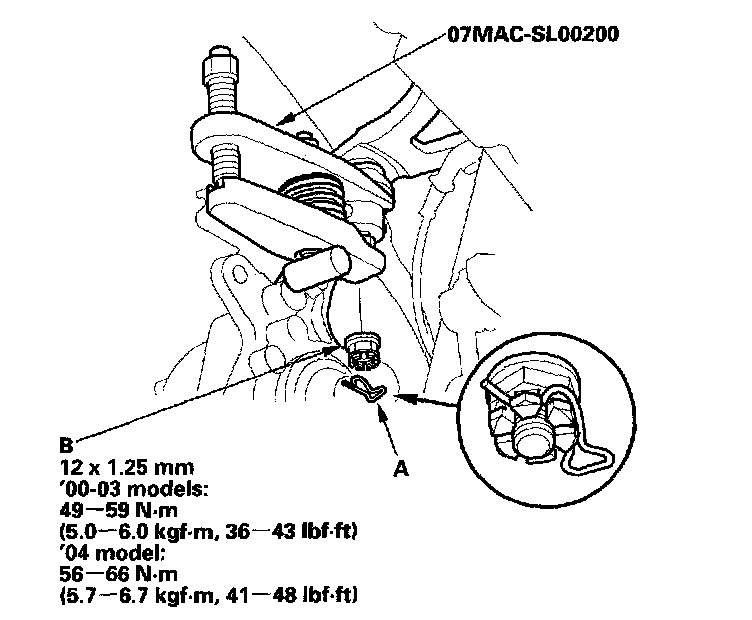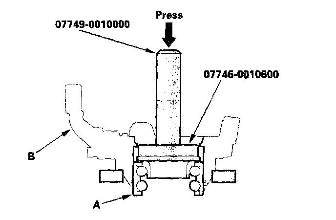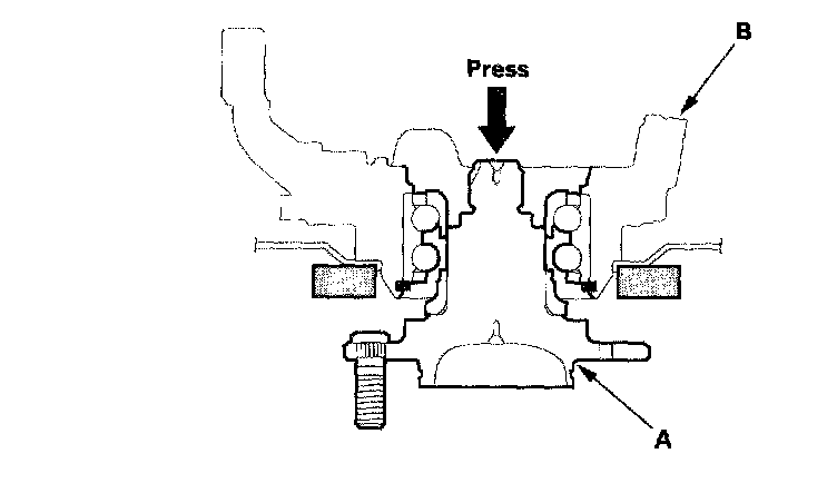 19. Separate the hub (A) from the knuckle (B) using a hydraulic press. Be careful not to deform the splash guard. Hold onto the hub to keep it from falling when pressed clear.