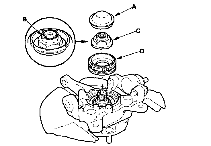30. Apply a small amount of engine oil to the seating surface of a new spindle nut (B). Install the nut, and tighten it to the specified torque value. Stake (C) the nut shoulder against the driveshaft with a drift.