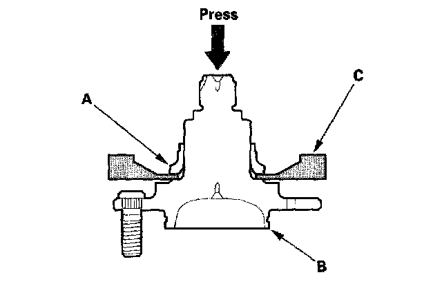 22. Press the wheel bearing inner race (A) out of the hub (B) using a commercially available bearing separator (C) and a press.