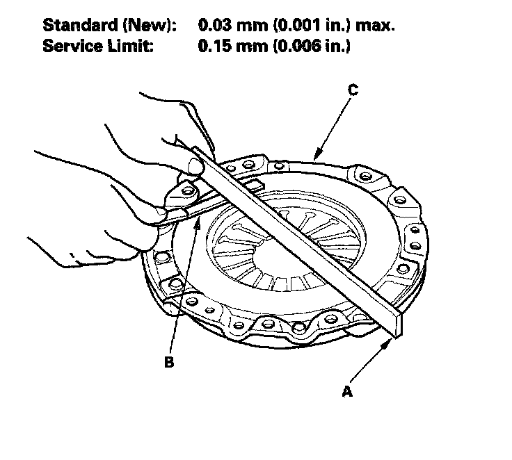 7. Inspect for warpage using a straight edge (A) and feeler gauge (B). Measure across the pressure plate (C). If the warpage is more than the service limit, replace the pressure plate.