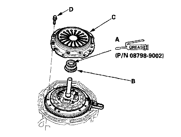 5. Install the pressure plate and the mounting bolts (D), finger-tight. Make sure the release bearing does not come off.