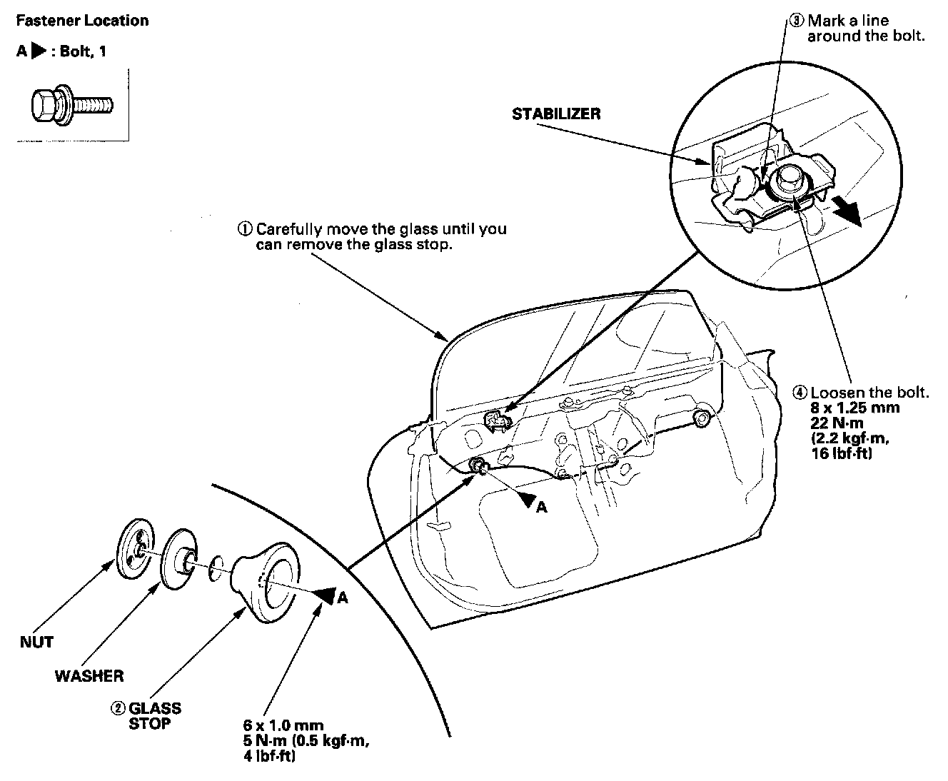 - Mark a line around the stabilizer mounting bolt, the glass mounting bolts, and the regulator mounting nuts to show the original locations.