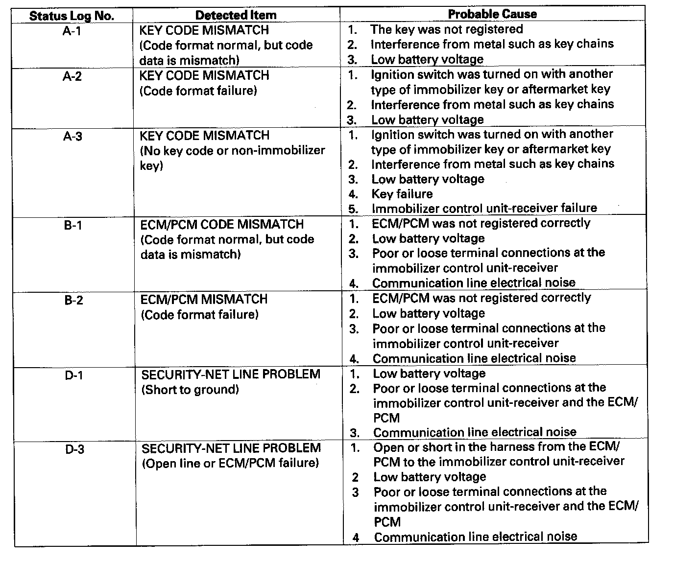 Status LogIf you suspect there is a immobilizer system problem, check the status log.