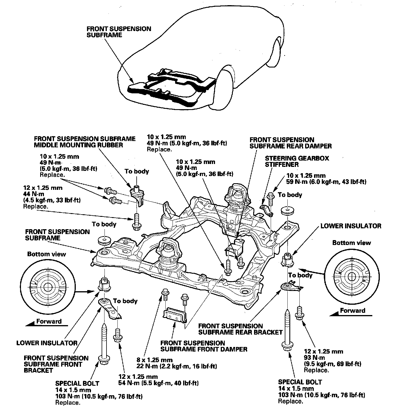 After removing the subframe mounting bolts, front suspension subframe middle mounting rubber mounting bolts, front suspension subframe rear bracket mounting bolts, and front suspension subframe rear damper front mounting bolt, be sure to replace them with new ones.
