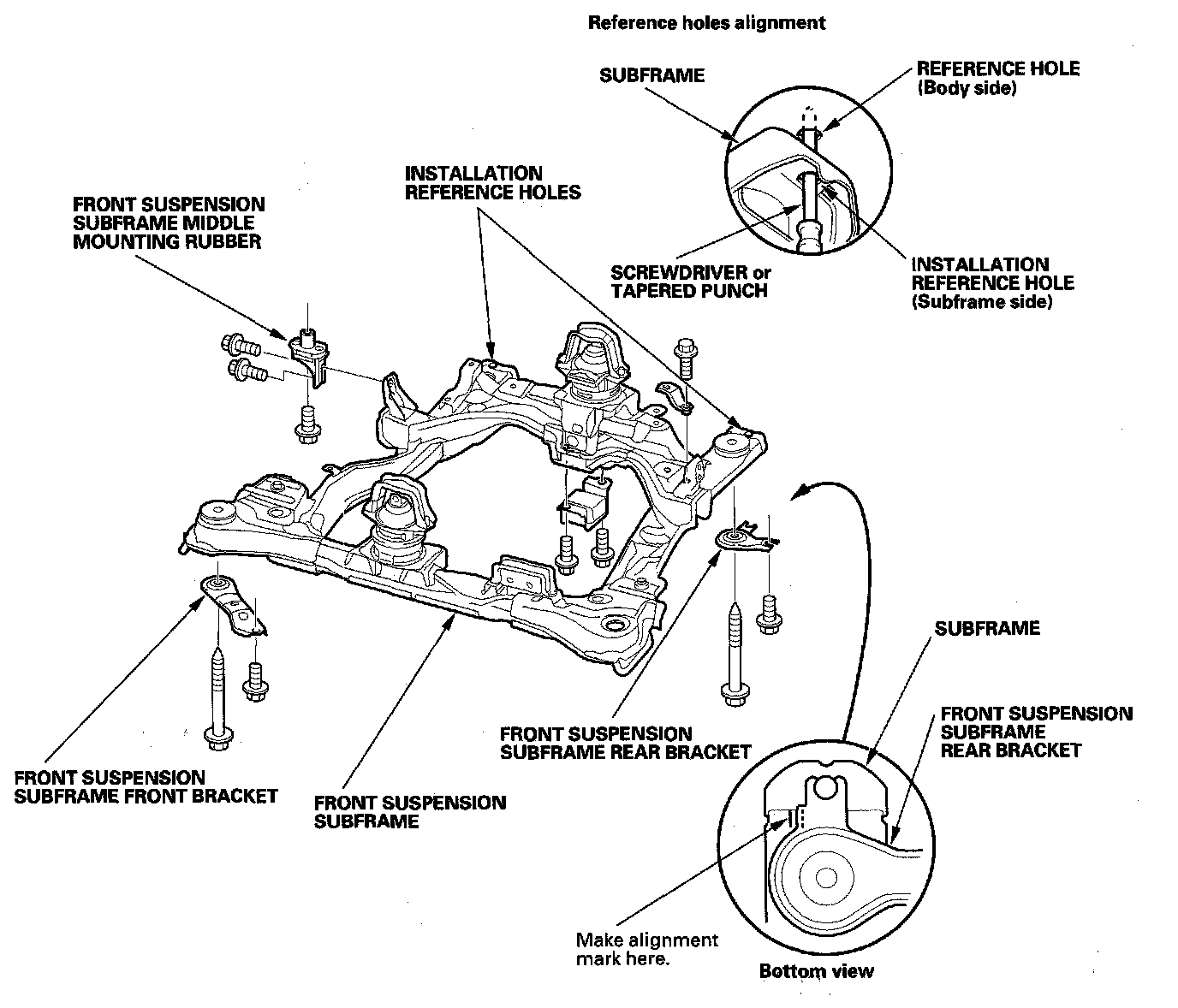 - When installing, align both installation reference holes in the subframe with both reference holes in the body using a screwdriver or tapered punch as a guide.