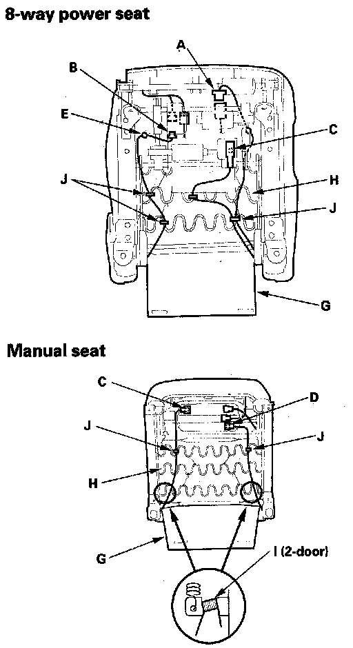 3. With recline motor and/or side airbag: From under the seat cushion, disconnect the recline motor connector (A), and if equipped, the seat-back heater connector (B) on the driver's 8-way power seat. Detach the side airbag connector clip (C), the OPDS/ODS unit connector clip (D) on the passenger's seat, and harness clips (E). Release the hook springs (F) (on some driver's seat) and seat cushion cover (G) from the seat cushion frame spring (H), release the hook strips (I) on 2-door passenger's seat, then pull the cover back, and remove the wire ties (J).