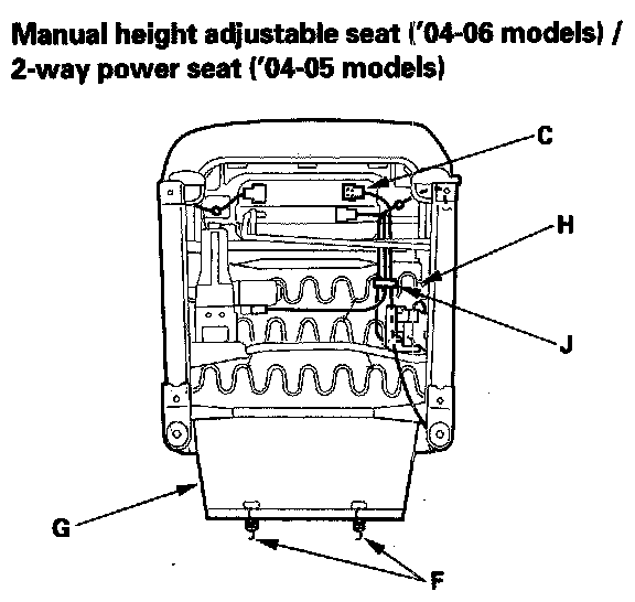 3. Remove these items from the front seat, then remove the seat-back, '03 model 2-door manual seat, '04-06 models 2-door manual seat, '03 model 4-door manual seat, '04-06 models 4-door manual seat, manual height adjustable seat, 2-way power seat, 8-way power seat: