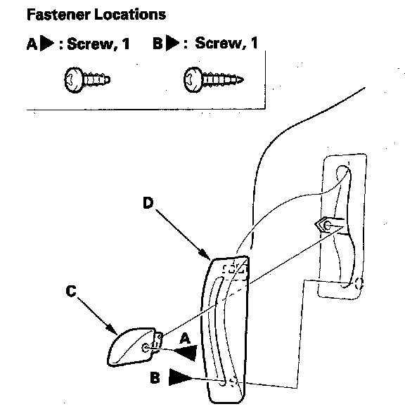 5. Remove the screws (A, B), then remove the rear seat access knob (C), and rear seat access trim (D).