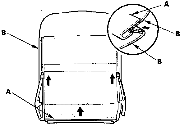 13. From the back of the seat-back, pass both lower retainers (A) through the slots in the seat-back pad, and on passenger's seat with side airbag release all of the clips (B).