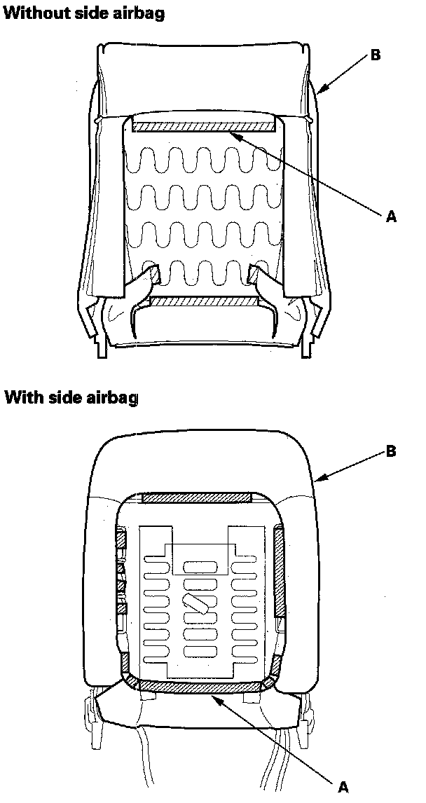 - With side airbag: Seats with a side airbag have a "SIDE AIRBAG" label on the seat-back. Because the component parts (seat-back cover, cushion, etc.) of seats with and without airbags are different, make sure you install only the correct replacement parts.