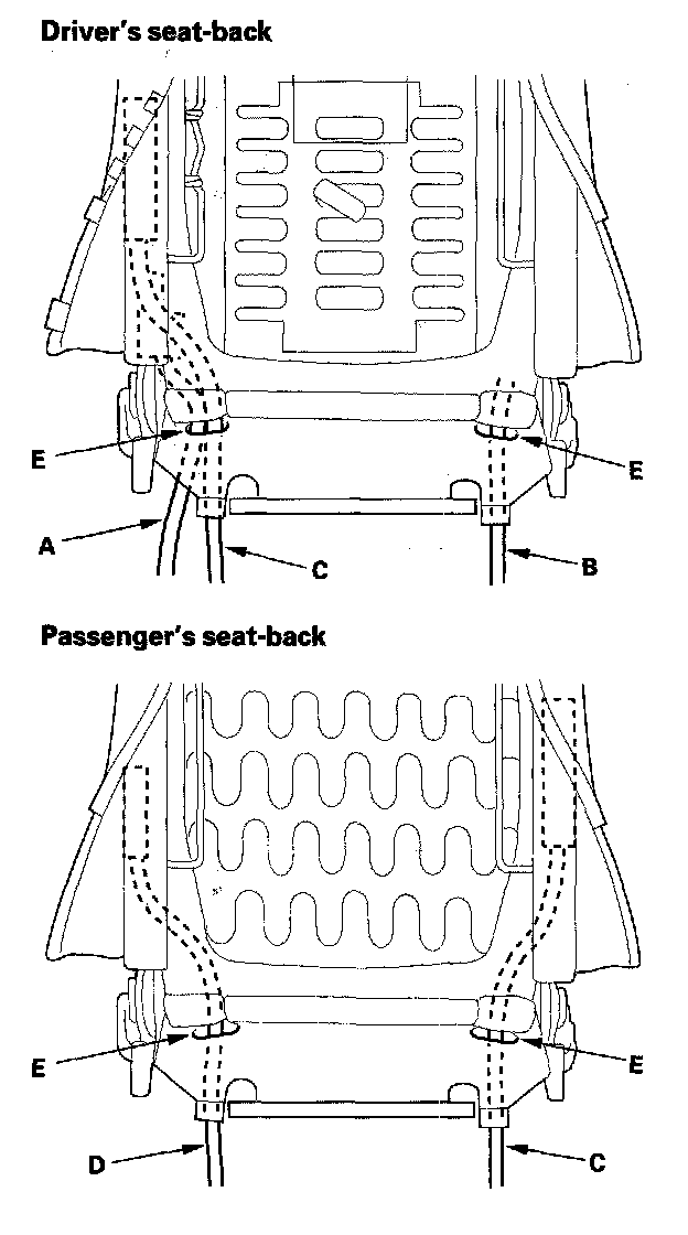10. With recline motor and/or side airbag: Pull the recline motor harness (A), seat-back heater harness (B) (some driver's seat), side airbag harness (C) and the OPDS/ODS harness (D) (passenger's seat) out through the holes (E) in the seat-back cover.