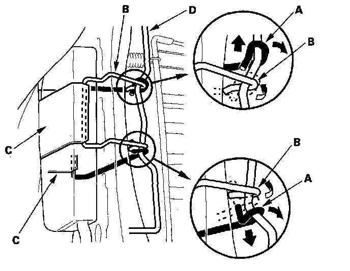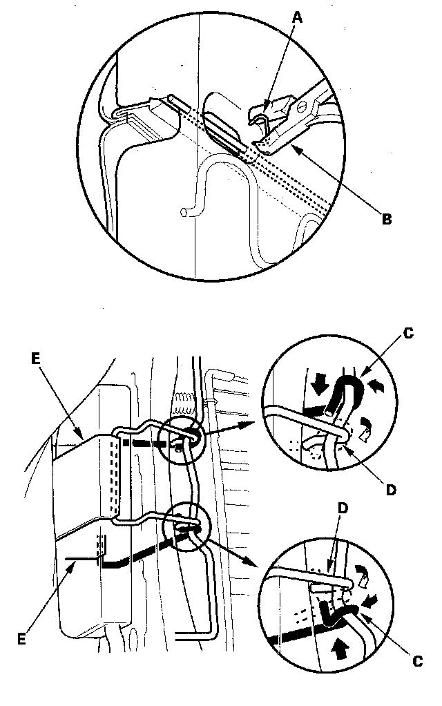 - Reinstall the front hook (C) and rear hook (D) of the reinforcing cloth (E) securely.