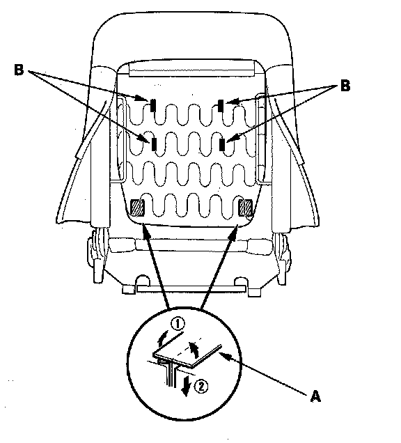 7. Release the clips (A) from under the seat cushion (B).