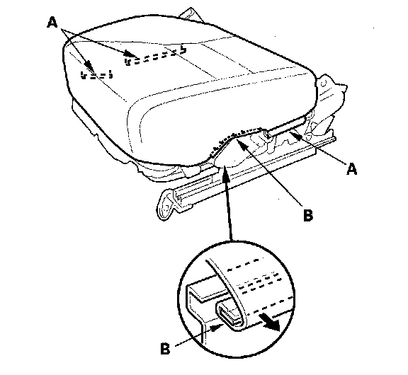 4. Release the hook strips (A) and retainers (B) (manual height adjustable seat) from both sides the seat cushion.