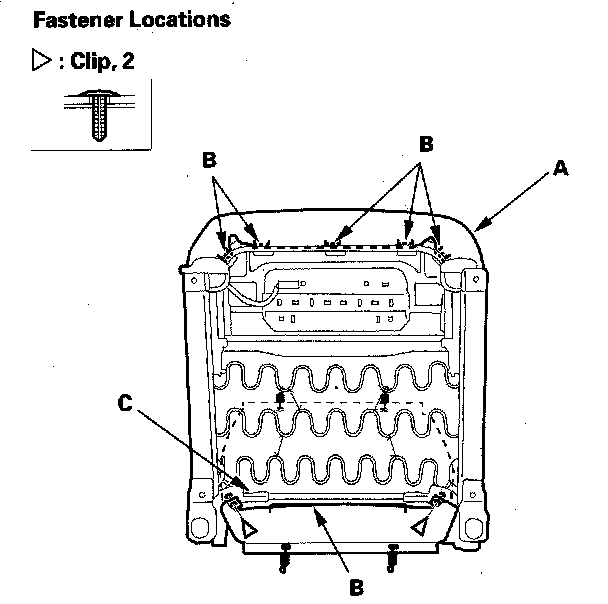 8. With side airbag: Detach the clips and hooks (A) by pulling the bottom of the back panel (B) back, then pull the panel downward to release the hooks (C) from the seat back frame, and remove the panel.