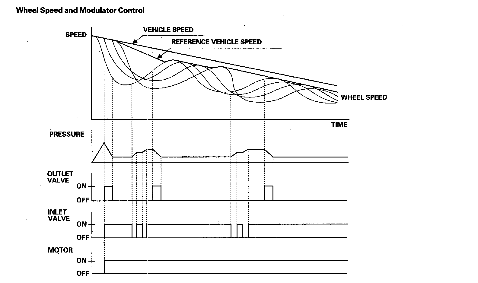 When the wheel speed drops sharply below the vehicle speed, the outlet valve opens momentarily to reduce the caliper fluid pressure. The pump motor starts at this time. As the wheel speed is restored, the inlet valve opens momentarily to increase the caliper fluid pressure.