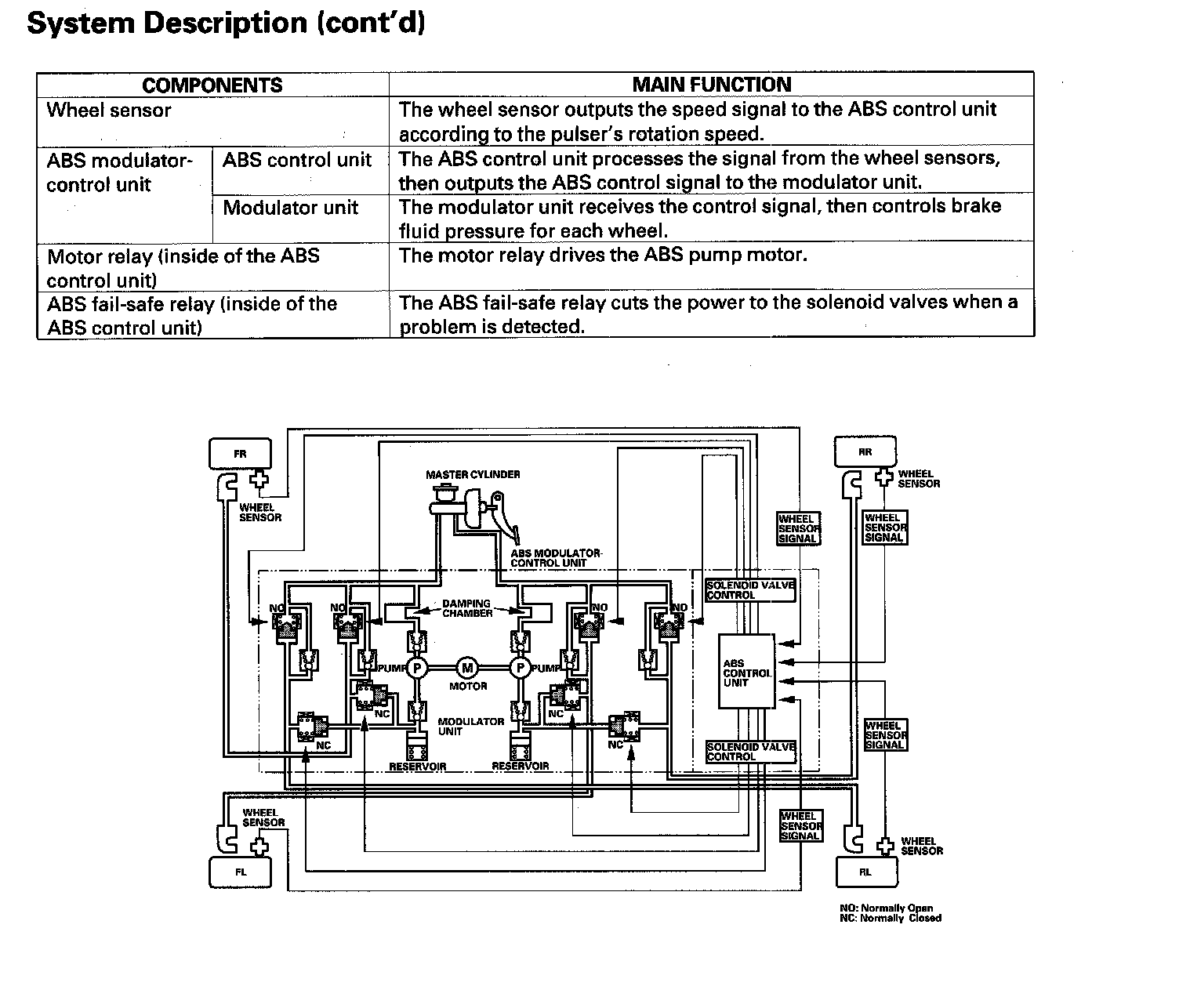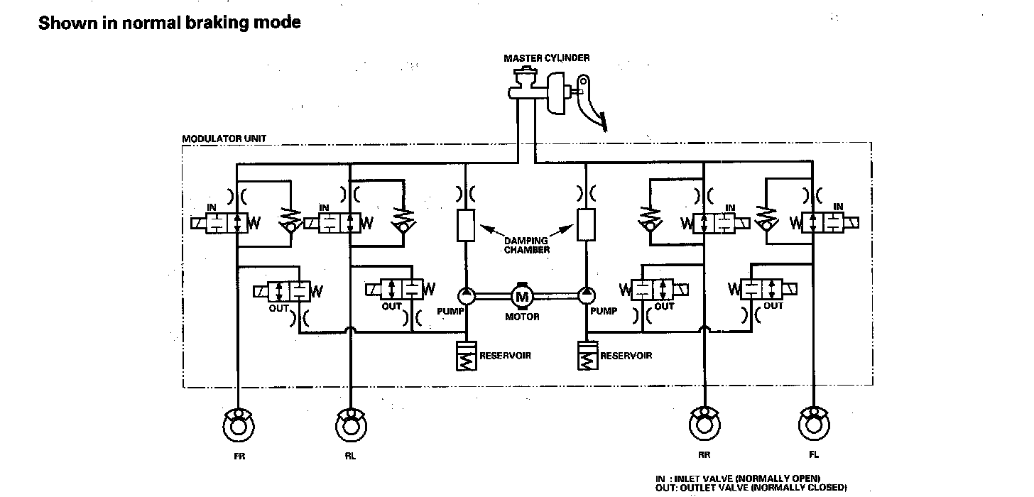 The ABS modulator consists of the inlet solenoid valve, outlet solenoid valve, reservoir, pump, and the pump motor. The modulator reduces the caliper fluid pressure directly. It is a circulating-type modulator because the brake fluid circulates through the caliper, reservoir, and the master cylinder. The hydraulic control has three modes: normal braking, pressure retaining, and pressure reducing. The hydraulic circuit is an independent four channel type, one channel for each wheel.