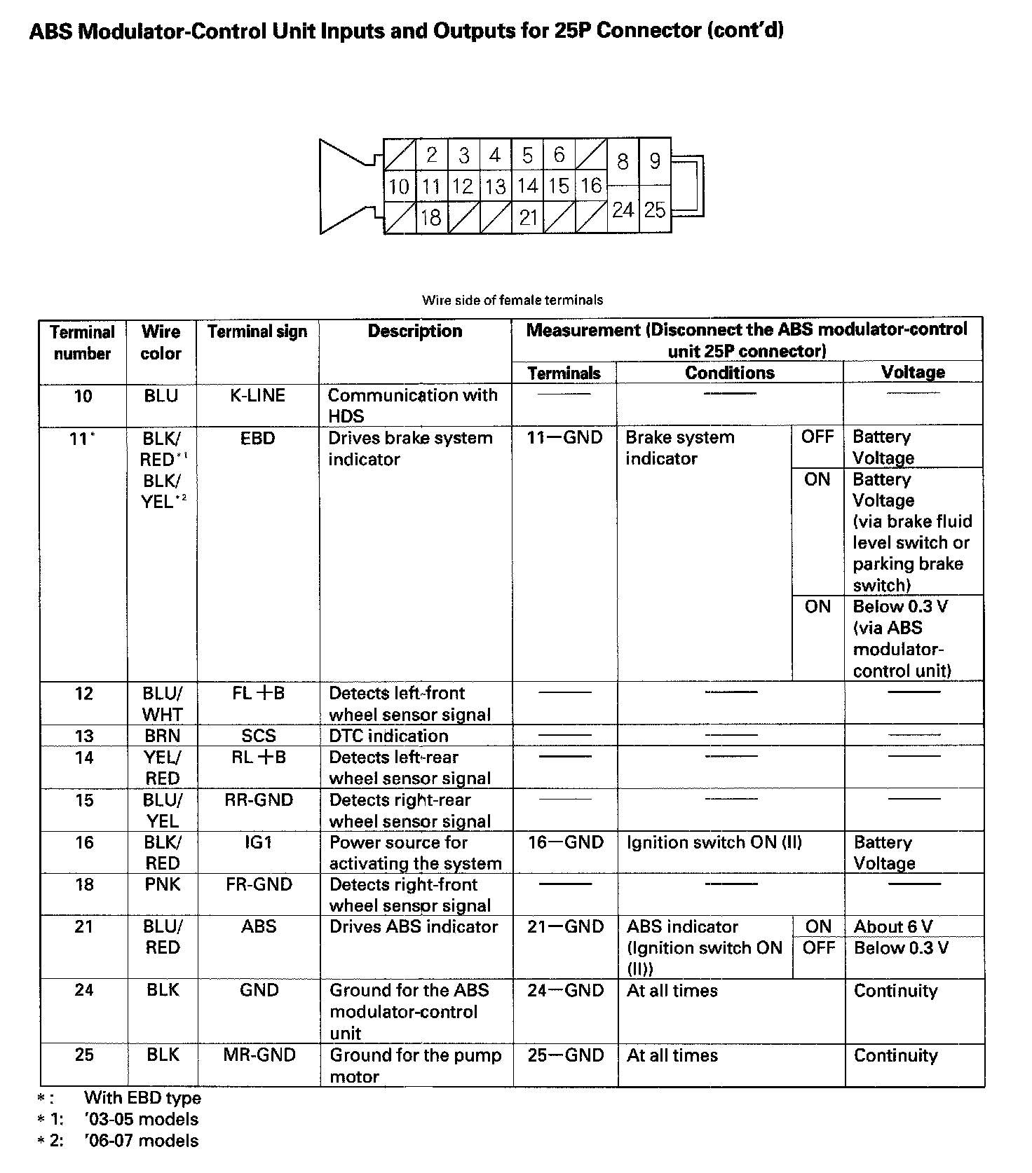 ABS Modulator-Control Unit Inputs And Outputs For 25P Connector: