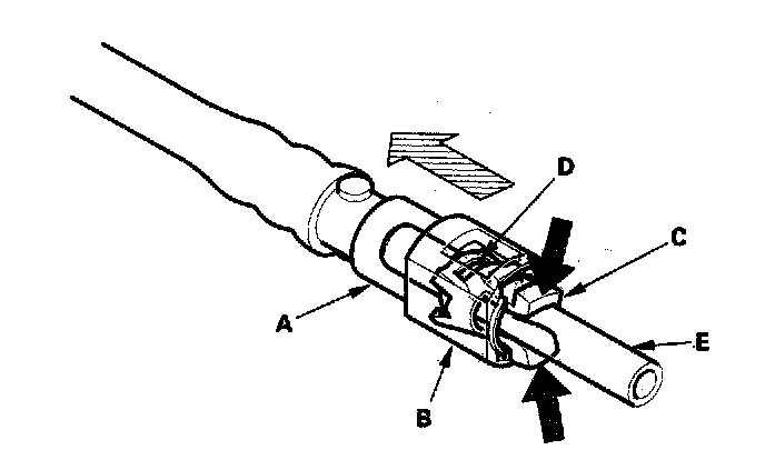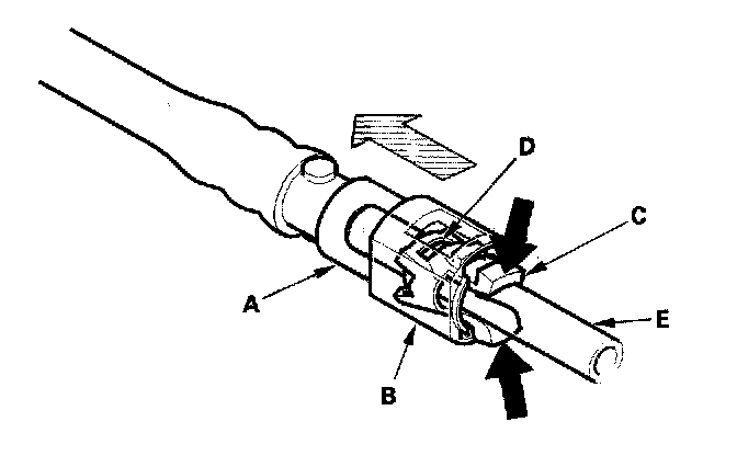 10. Disconnect the quick-connect fitting (A): Hold the connector (B) with one hand, and squeeze the retainer tabs (C) with the other hand to release them from the locking tabs (D). Pull the connector off.