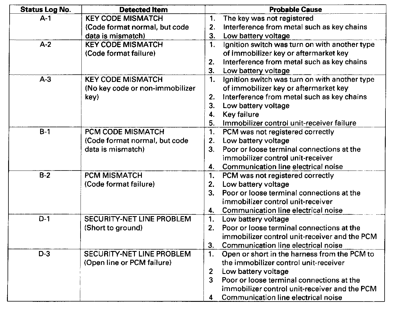 Status LogIf you suspect there is a immobilizer system problem, check the status log.