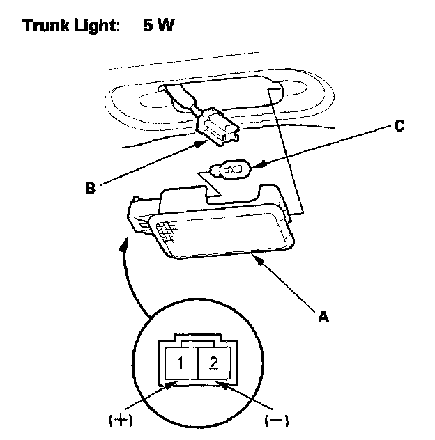4. Check for continuity between the No. 1 (+) and No. 2 (-) terminals. There should be continuity. If there is no continuity, check the bulb (C). If the bulb(s) is OK, replace the trunk light.