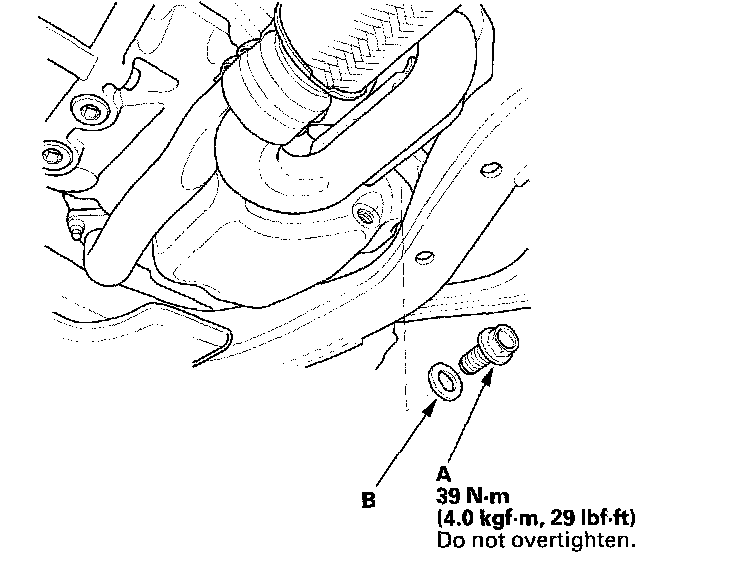 3. Reinstall the drain bolt with a new washer (B),