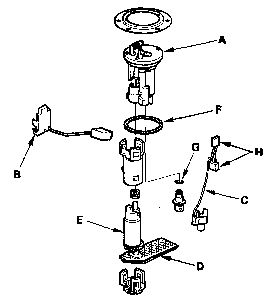 3. Remove the strainer case (A), the fuel gauge sending unit (B), and the wire harness (C).