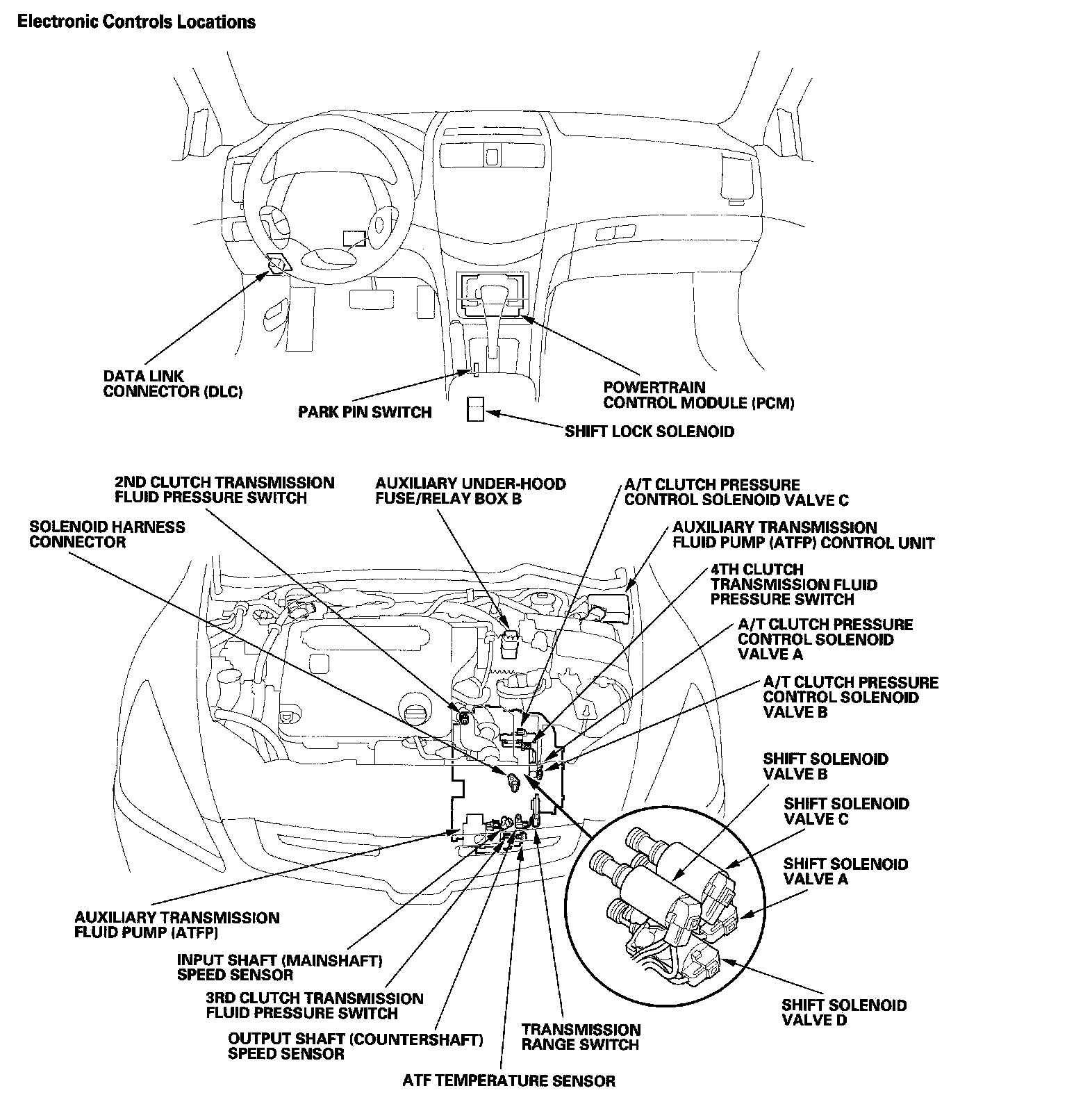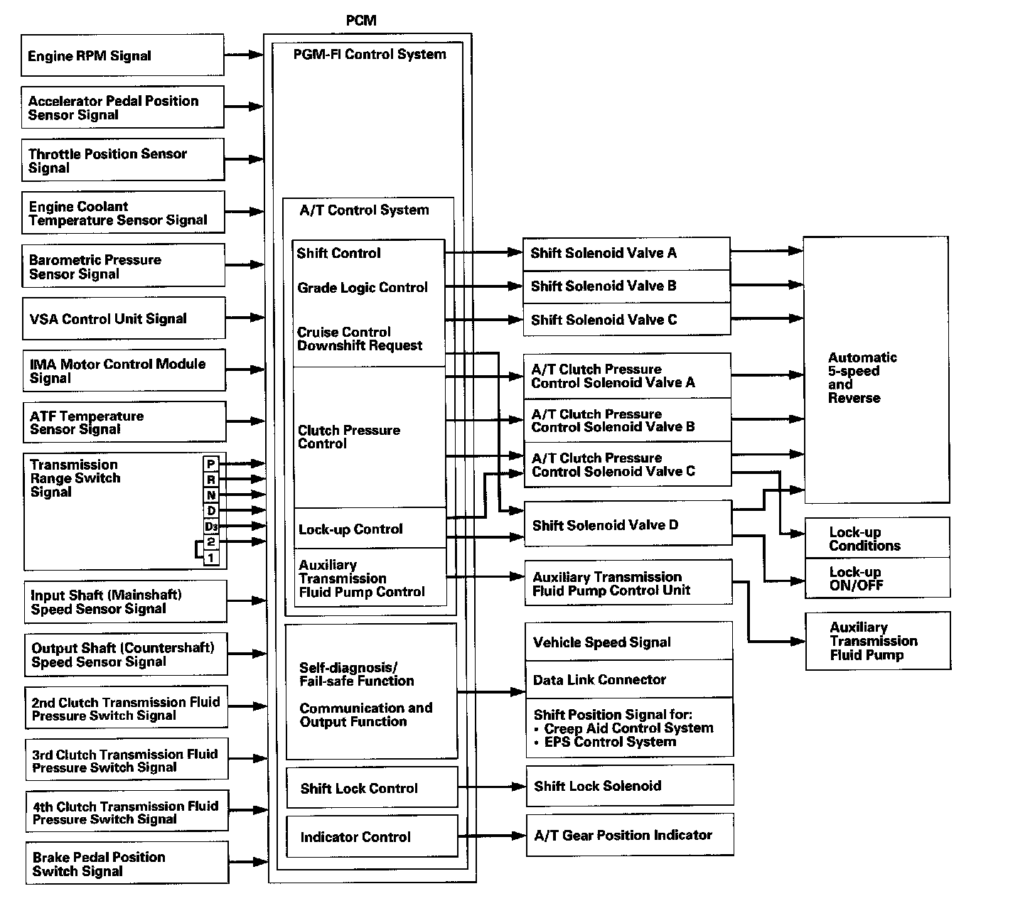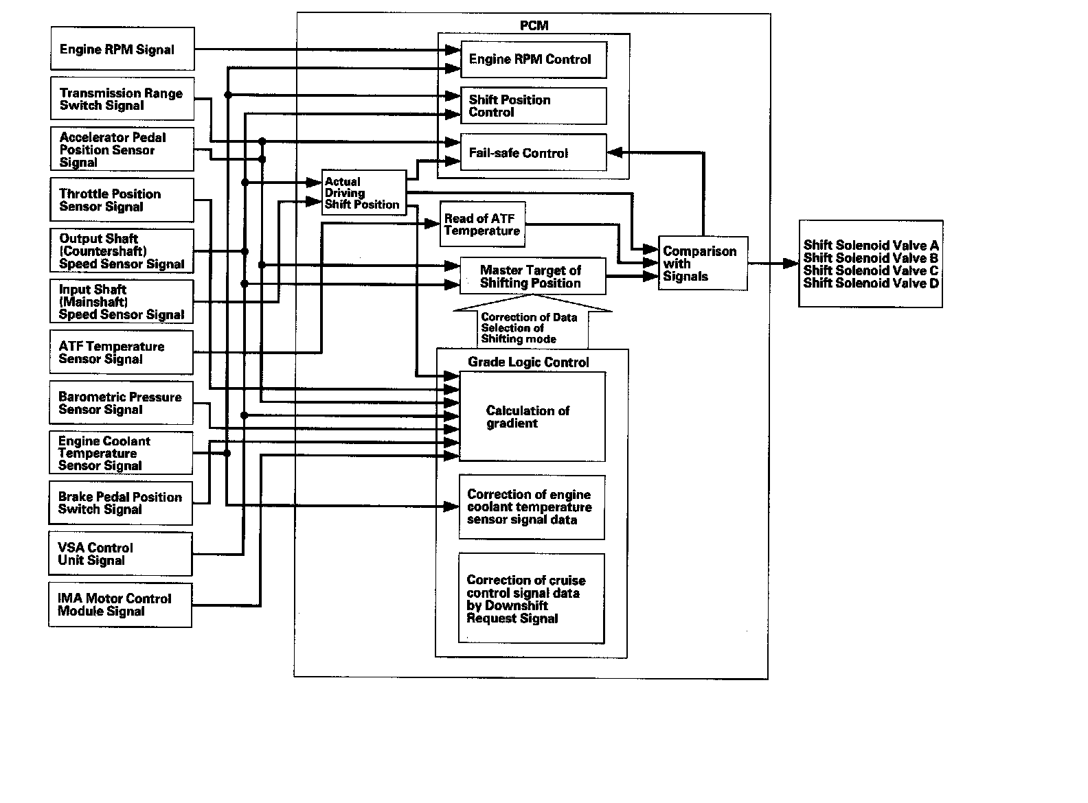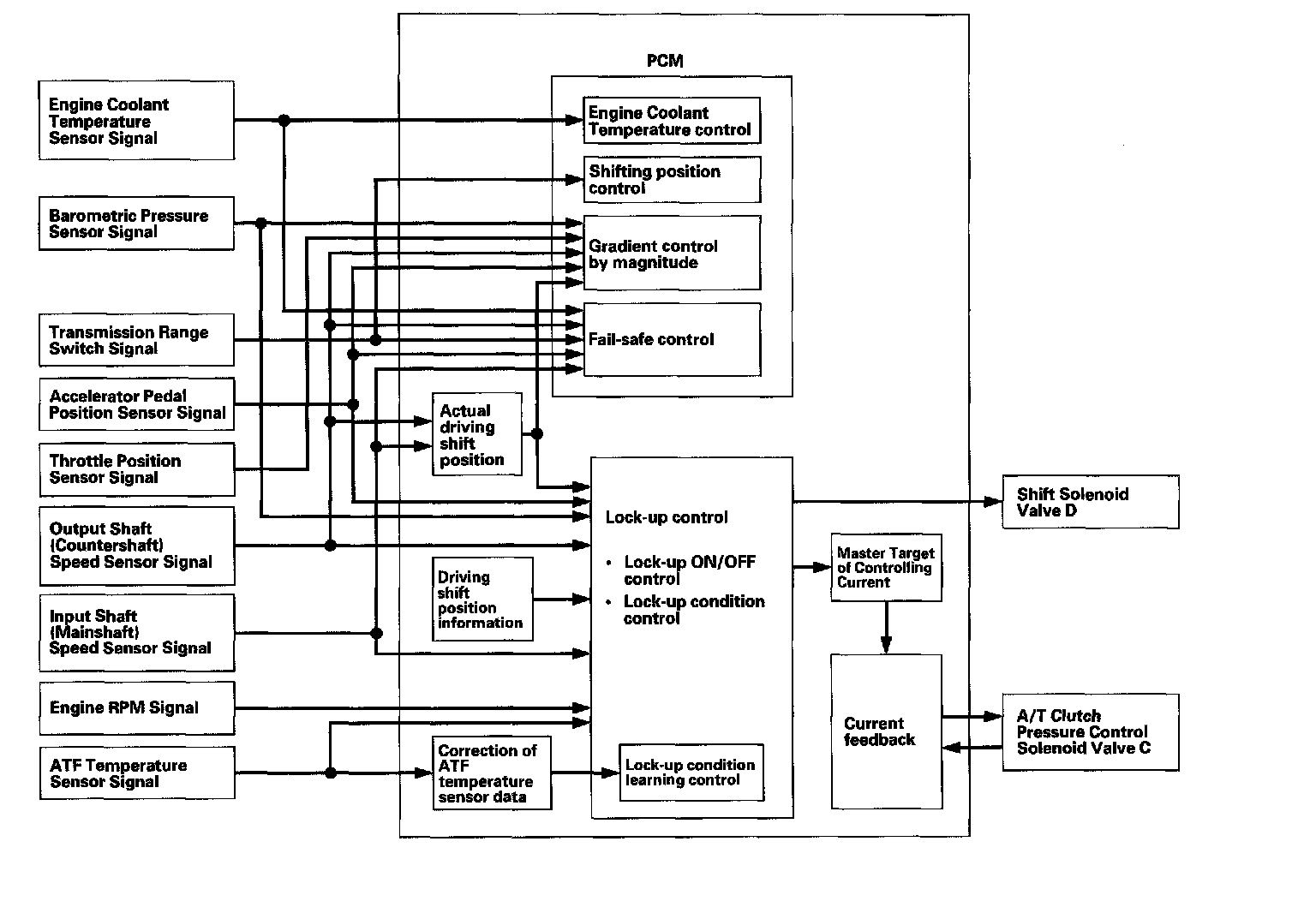 Electronic Control SystemElectronic Control seven solenoid valves. The electronic control system consists of the powertrain control module (PCM), sensors, and Shifting and lock-up are electronically controlled for comfortable driving under all conditions.