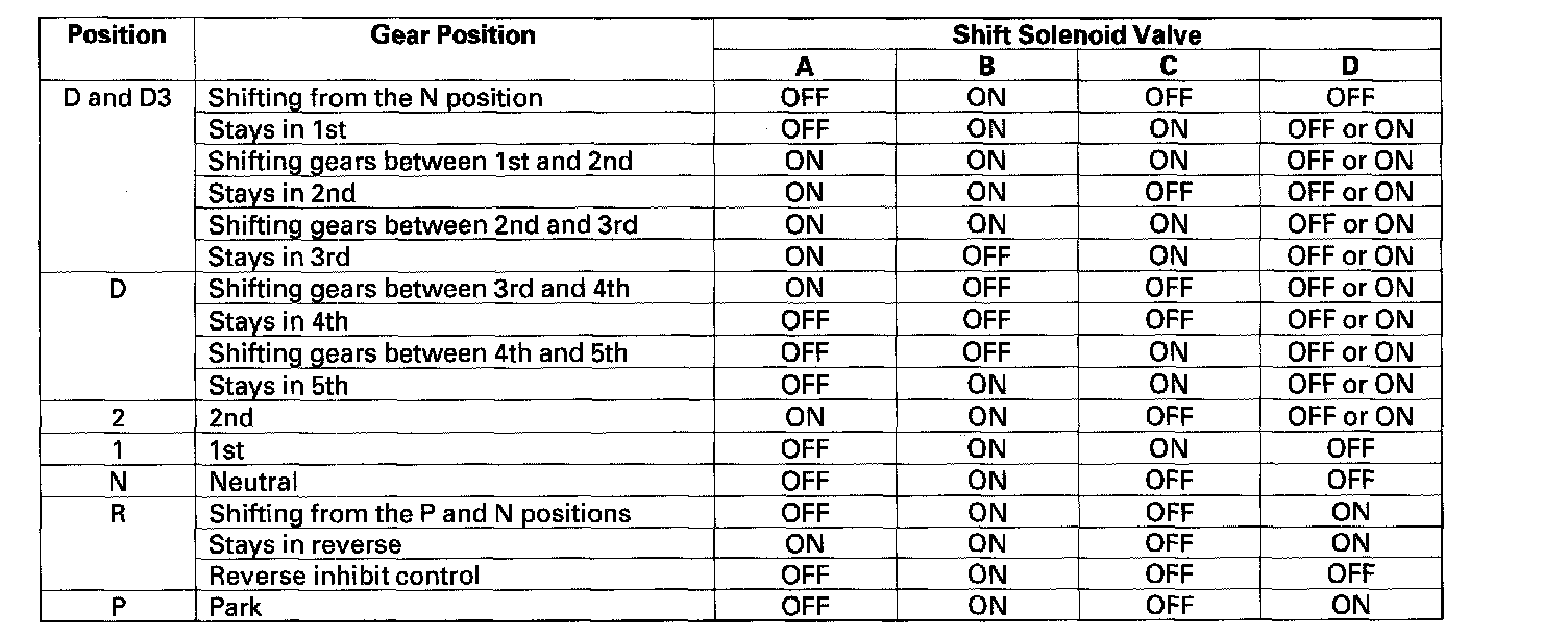 The shift solenoid valves have two types: Shift solenoid valves A and D use ON-OPEN/OFF-CLOSE type; shift solenoid valve opens the port of shift solenoid valve pressure while shift solenoid valve is turned ON by the PCM, and closes the port when shift solenoid valve is OFF. Shift solenoid valves B and C use ON-CLOSE/OFF-OPEN type; shift solenoid valve closes the port of shift solenoid valve pressure while shift solenoid valve is turned ON by the PCM, and opens the port when shift solenoid valve is OFF.