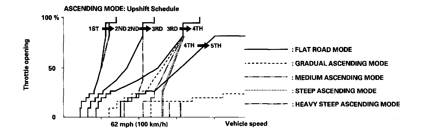 When the PCM determines that the vehicle is going down a hill in the D and D3 positions, the shift-up speed from 4th to 5th gear, 3rd to 4th gear, and from 2nd to 3rd (when the throttle is closed) becomes faster than the set speed for flat road driving to widen the 4th gear, 3rd gear, and 2nd gear driving areas. This, in combination with engine braking from the deceleration lock-up, achieves smooth driving when the vehicle is descending. There are three descending modes with different 4th gear driving areas, 3rd gear driving areas and 2nd gear driving areas according to the magnitude of a gradient stored in the PCM. When the vehicle is in 5th or 4th gear and you are decelerating while applying the brakes on a steep hill, the transmission will downshift to a lower gear. When you accelerate, the transmission will then return to a higher gear.