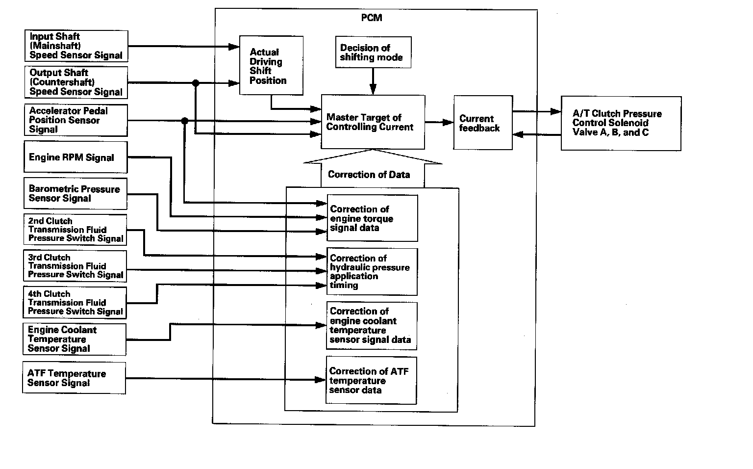 The PCM actuates the A/T clutch pressure control solenoid valves A, B, and C to control the clutch pressure. When shifting between gears, the clutch pressure regulated by the A/T clutch pressure control solenoid valves A, B, and C engages and disengages the clutch smoothly. The PCM receives input signals from the various sensors and switches, performs processing data, and outputs current to the A/T clutch pressure control solenoid valves A, B, and C.