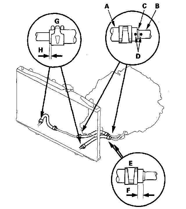 4. Secure the hoses at the ATF cooler with the clips (G) at 2 - 4 mm (0.1 - 0.2 inch) (H) from the hose ends.