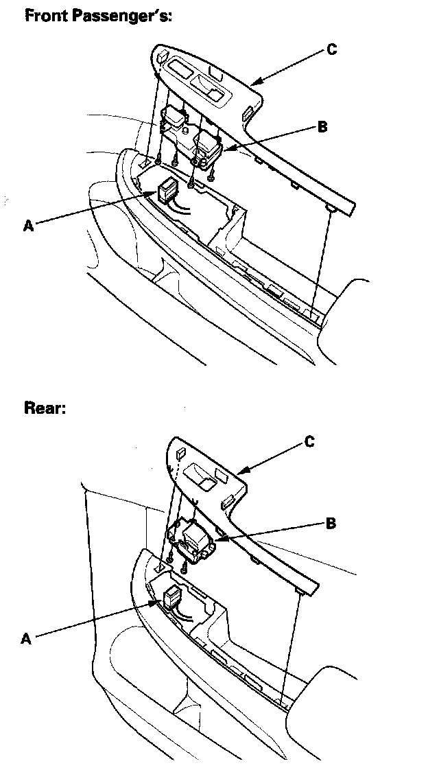 2. Disconnect the power window switch connector (A), then remove the three mounting screws and the power window switch (B) from the switch trim (C).