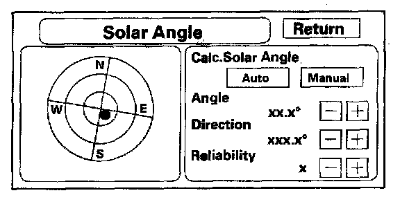 - The screen shows a circular diagram of the sky oriented in the direction that the vehicle is pointing. During daylight hours a red dot is shown, representing the direction and elevation of the sun. The outer circle represents the horizon (0 degree elevation). The middle circle is 30 degrees, the center circle is 60 degrees, and the very center is directly overhead (90 degrees).