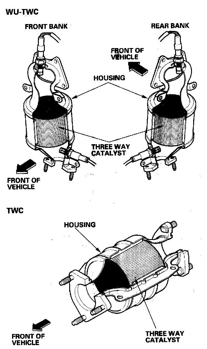 The WU-TWC/TWC converts hydrocarbons (HC), carbon monoxide (CO), and oxides of nitrogen (NOx) in the exhaust gas to carbon dioxide (CO2), nitrogen (N2), and water vapor.