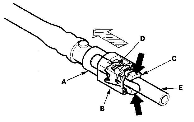 10. Disconnect the quick-connect fitting (A): Hold the connector (B) with one hand, and squeeze the retainer tabs (C) with the other hand to release them from the locking tabs (D). Pull the connector off.