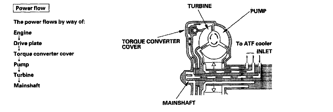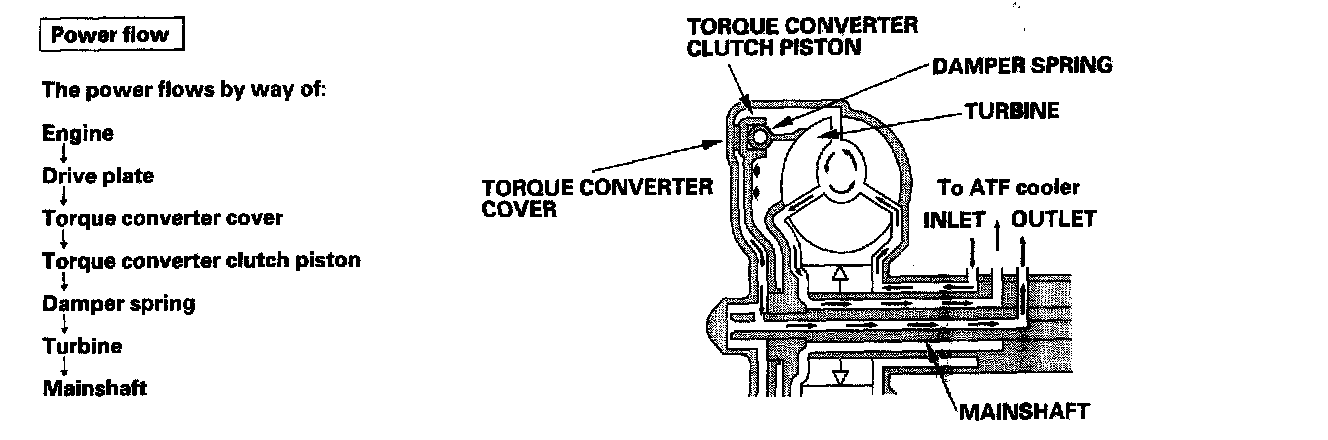 Fluid entered from the chamber between the torque converter cover and the torque converter clutch piston passes through the torque converter and goes out through the chambers between the turbine and the stator, and between the pump and the stator. As a result, the torque converter clutch piston moves away from the torque converter cover, and the torque converter clutch is released; torque converter clutch lock-up OFF.