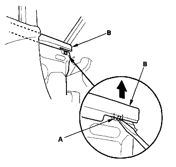 2. Release the front hook (A) from inside of the door, then pull up the front door glass outer weatherstrip (B).