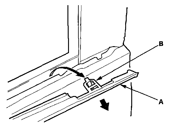 5. Twist the front door glass outer weatherstrip (A) to pull the rear hook (B) out from the inside of the door, then remove the weatherstrip.