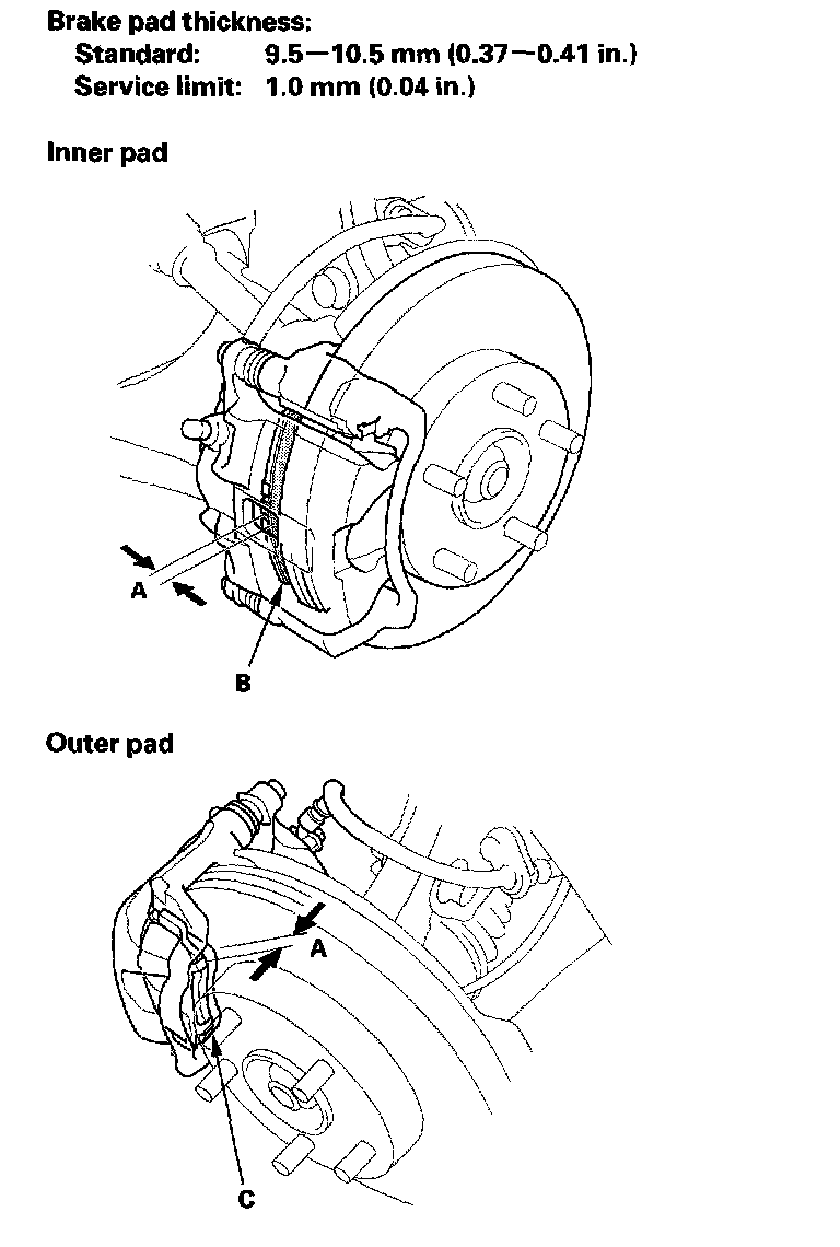 3. Check the thickness (A) of the inner pad (B) and outer pad (C). Do not include the thickness of the backing plate.