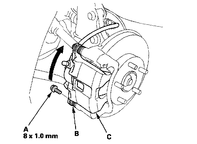 3. Remove the flange bolt (A) while holding the caliper pin (B) with a wrench. Be careful not to damage the pin boot. Then pivot the caliper (C) up out of the way. Check the hose and pin boots for damage and deterioration.