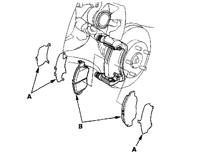 7. Clean the caliper bracket (B) thoroughly; remove any rust, and check for grooves and cracks.