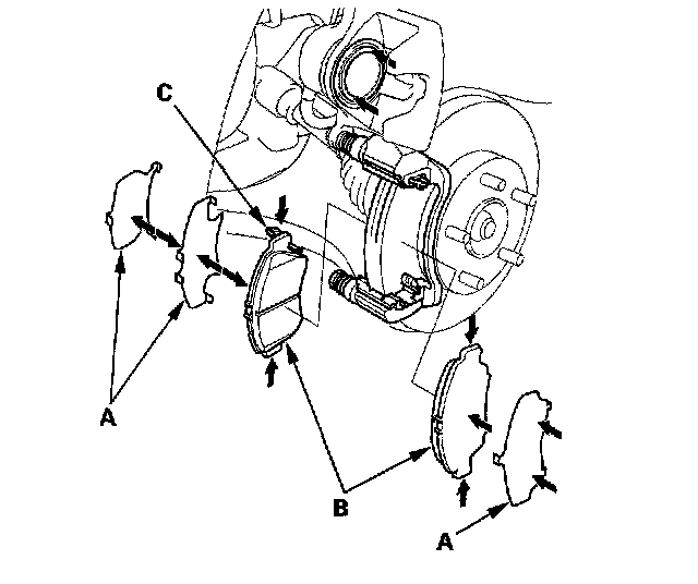 12. Install the brake pads and pad shims correctly. Install the brake pad with the wear indicator (C) on the upper inside. If you are reusing the brake pads, always reinstall the brake pads in their original positions to prevent a momentary loss of braking efficiency.