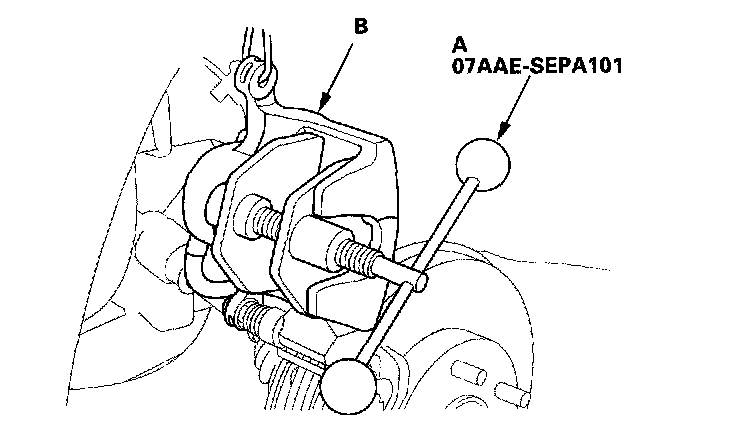 13. Mount the brake caliper piston compressor (A) on the caliper body (B).