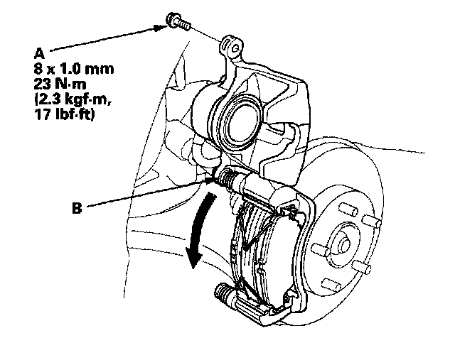 17. Pivot the caliper down into position. Install the flange bolt (A), and tighten it to the specified torque while holding the caliper pin (B) with a wrench. Be careful not to damage the pin boot.