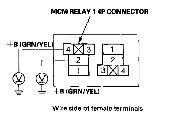 20. Measure voltage between body ground and MCM relay 14P connector terminals No. 2 and No. 4 individually.