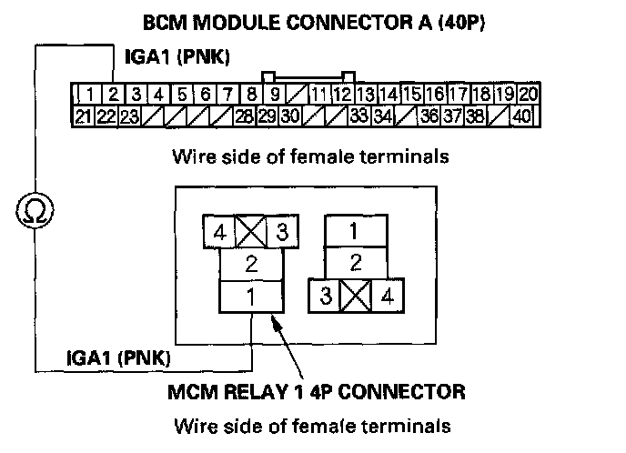 26. Check for continuity between BCM module connector terminal A2 and MCM relay 14P connector terminal No. 1.